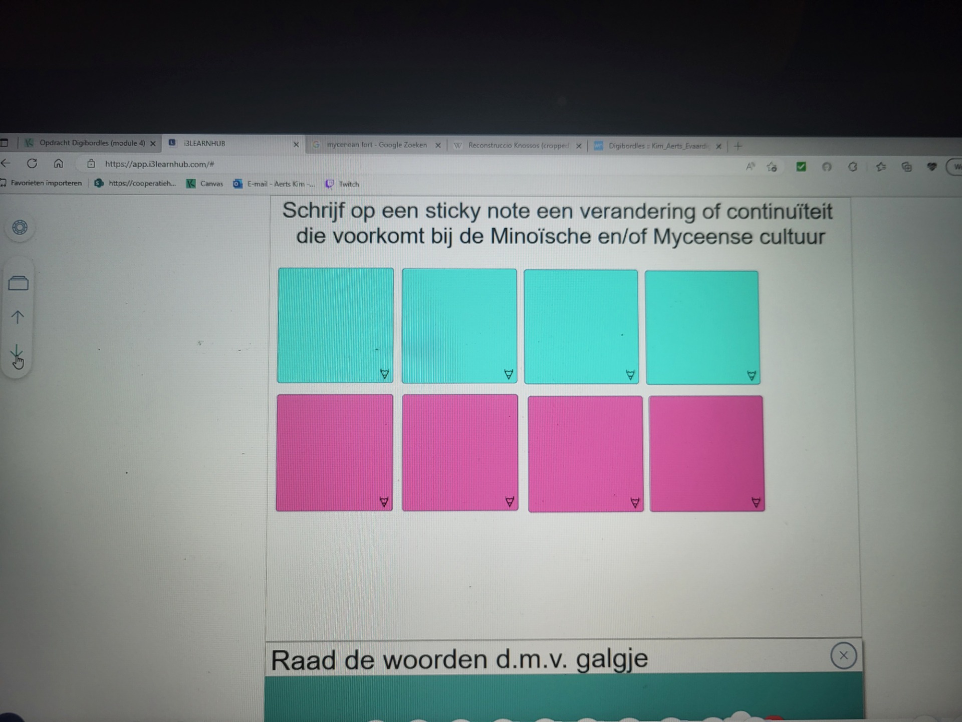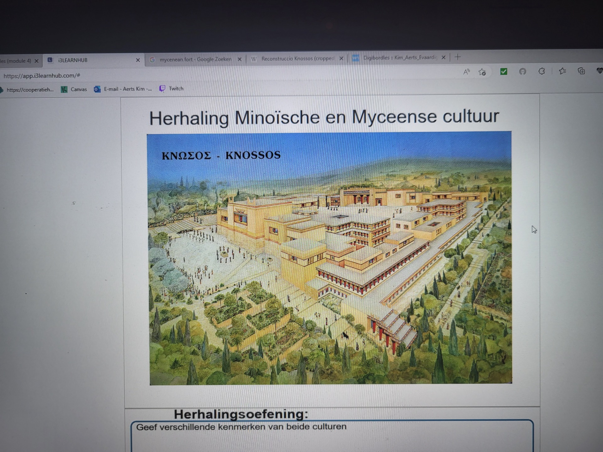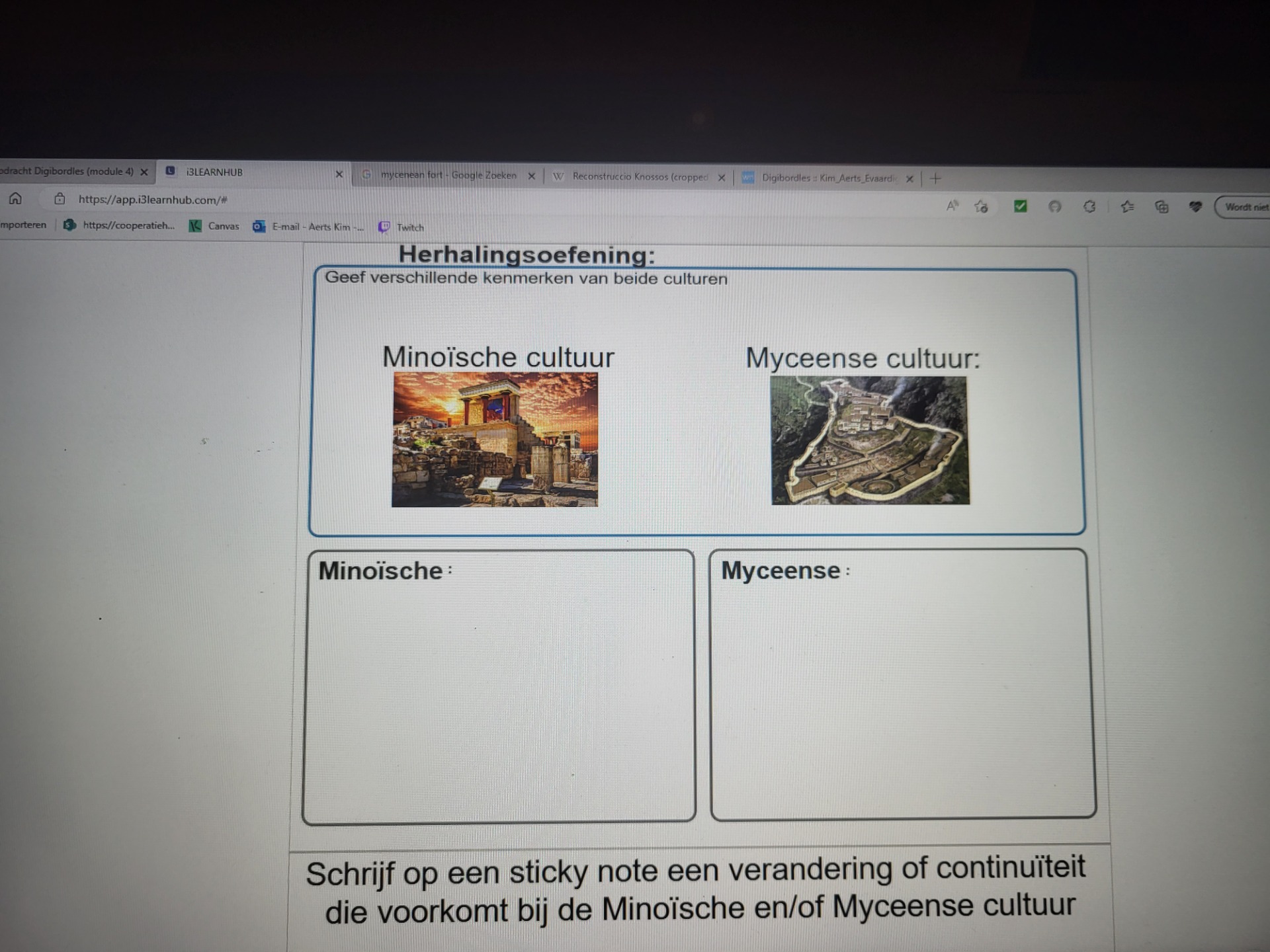 Bij deze slide laat ik leerlingen naar het bord komen om zo veel mogelijk studenten een kenmerk van de Minoïsche of Myceense cultuur op te laten schrijven. Zo denken ze actief na over kenmerken en moeten ze de leerstof van vorige week herhalen.